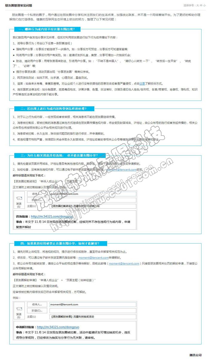 腾讯近段时间为了整治朋友圈乱象的局面,2014年11月17日在微信官方网站发布了朋友圈管理常见问题。针对朋友圈的混乱营销现象,做了具体规定,并给出了处理意见和建议。 为了能让大家更加清楚地了解朋友圈管理的详细规则,我们将内容整理如下图: